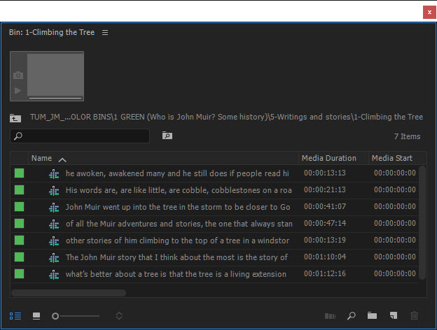 Selects Sequences: For each interview subject, build a single sequence containing only the segments worth keeping — your selects. This is a pre-edit of each person’s interview, stripped of everything already decided not to use. When building the actual film, you pull from selects rather than re-reviewing hours of raw footage. On John Muir, each subject’s full hour of footage became a selects sequence of roughly 10 minutes of usable material.